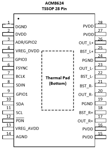 ACM8624 一款高度集成、高效率的雙通道數(shù)字輸入功放。供電電壓范圍在 4.5V-26.4V,數(shù)字電源是 3.3V或者1.8V。在 6 歐負(fù)載下,輸出功率可以到 2×33W,PBTL 模式下單通道可以輸出 1×66W @1% THD+N.