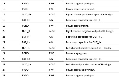 - 供電電壓范圍 PVDD: 4.5V to 26.4V