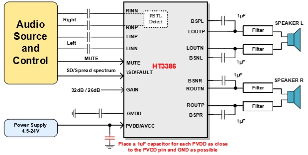 此外,HT3386內(nèi)置關(guān)斷功能使待機(jī)電流最 小化,同時(shí)內(nèi)置了MUTE功能,還集成了過壓保 護(hù)、直流保護(hù)、短路保護(hù)、熱保護(hù)和電源欠壓 異常保護(hù)等功能,可全面防止出現(xiàn)故障。