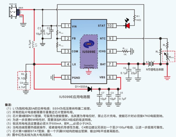 IU5099E是—款5V輸入,最大2A充電電流, 支持2-3節(jié)鋰離子電池/磷酸鐵鋰電池串聯(lián)應(yīng)用的升壓充電管理IC。IU5099E集成功率MOS,采用異步開關(guān)架構(gòu) ,使其在應(yīng)用時(shí)僅需極少的外圍器件,可有效減少整體方案尺寸,降低BOM成本。IU5099E的升壓開關(guān)充電轉(zhuǎn)換器的工作頻率為500KHz,轉(zhuǎn)換效率為90%。
