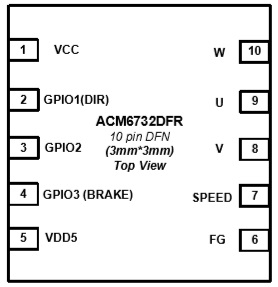 ACM6732支持多種保護(hù)機(jī)制用來保護(hù)ACM6732自身以及外部電機(jī).DFN-10封裝。