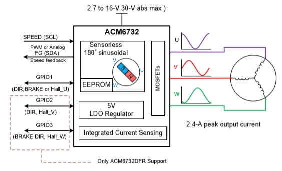 ACM6732支持 180゜正弦驅(qū)動(dòng),有效避免因高次諧波導(dǎo)致的電磁音干擾.也支持方波驅(qū)動(dòng),適用于快速啟動(dòng)大扭矩的應(yīng)用場(chǎng)景。 ACM6732可以根據(jù)用戶提供的電機(jī)參數(shù)進(jìn)行有效啟動(dòng)、加速以及恒轉(zhuǎn)速或者電壓運(yùn)行.用戶參數(shù)可以通過燒寫長期固定(其中). ACM6732支持多種速度控制.外部 PWM 占空比調(diào)速、外部模擬電壓調(diào)速以及外部 PWM 頻率調(diào)速.