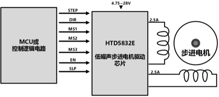 HTD5832E可使電機(jī)工作時噪聲降低,即使是以整步運(yùn)行,也能達(dá)到平滑的轉(zhuǎn)動效果。