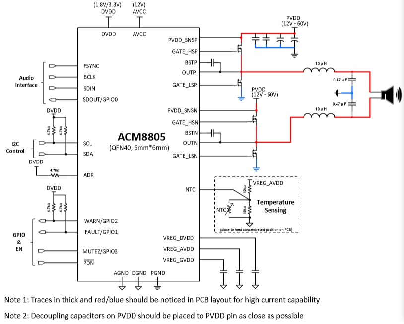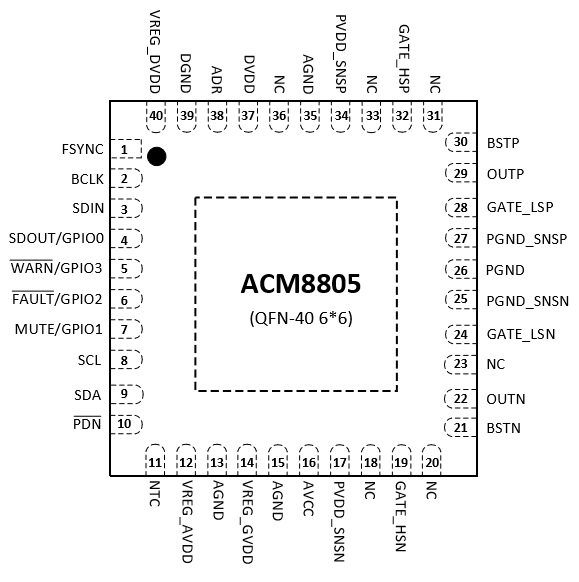 ACM8805是一款具有數(shù)字輸入的單通道D類音頻功放控制器,帶有5V柵極驅(qū)動器,用于驅(qū)動外部GaN HEMT或MOSFET。外圍應(yīng)用電路只需很少的元件就可在4.5V至80V的PVDD電源、3.3V或1.8V的DVDD電源下工作。