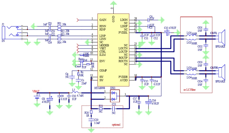 此外,HTA8998內(nèi)部集成免濾波器調(diào)制技術(shù), 能夠直接驅(qū)動揚聲器,內(nèi)置的關(guān)斷功能使待機電流最小化,還集成了輸出端過流保護、片內(nèi)過溫保護、輸入電源欠壓異常保護、升壓電壓過壓保護等功能。
