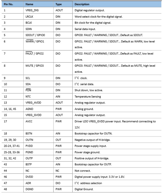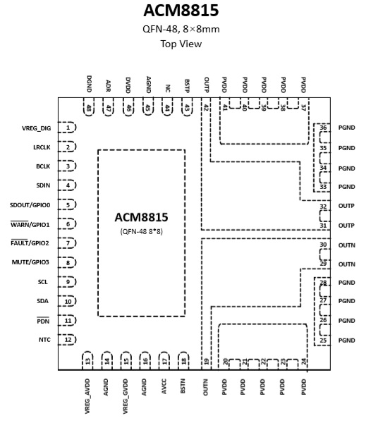 ACM8815 集成ClassH控制功能,為提高電池供電系統(tǒng)的效率和降低功耗提供了一種新方案。采用QFN-48(8.0mm×8.0mm)封裝。