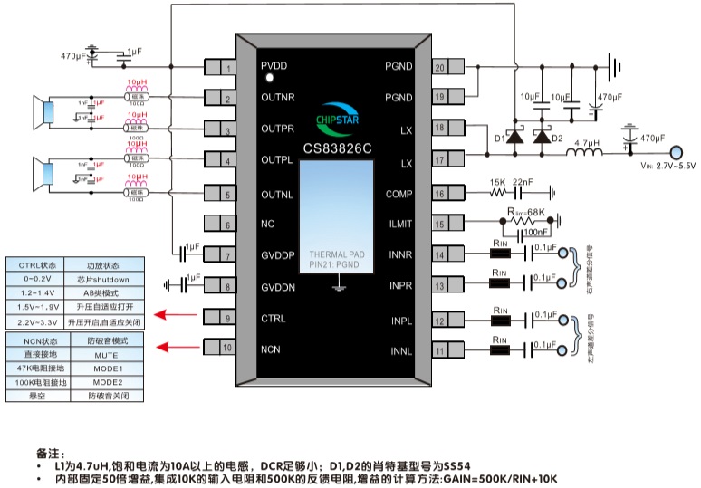 在單節(jié)鋰電池供電的情況下,CS83826C可以驅(qū)動低至4Ω的負(fù)載,最大輸出2×8W@10%的恒定功率.CS83826C自帶3個自適應(yīng)升壓點,可以根據(jù)輸入的音頻信號大小,自動選擇其升壓點,使得功放系統(tǒng)盡可能的提升效率,延長功放的播放時間。AB/D類可切換模式的設(shè)計,最大限度的減少音頻子系統(tǒng)中功放對FM的干擾,為終端產(chǎn)品提供了更為極致的功率輸出.