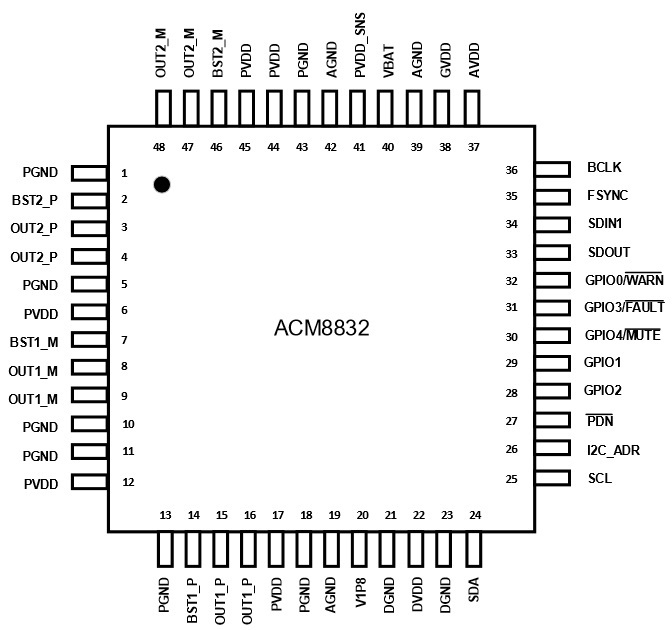 ACM8832一款高度集成、高效率、低EMI的雙通道數(shù)字輸入D類音頻功放。