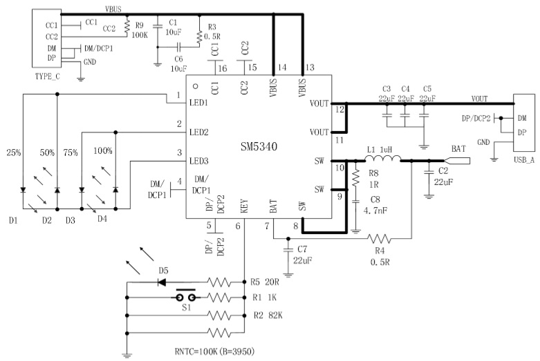 SM5340是一款集成升壓轉換器、鋰電池充電管理、電池電量指示的多功能電源管理SOC,為移動電源提供完整的電源解決方案。